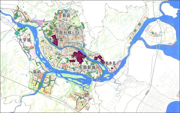 仓山片:规划总面积7.53km2,位于福州市南台岛东侧,四至范围:东临岷江,北至盖山镇高湖村,西至盖山镇中山村,南至规划三环路。