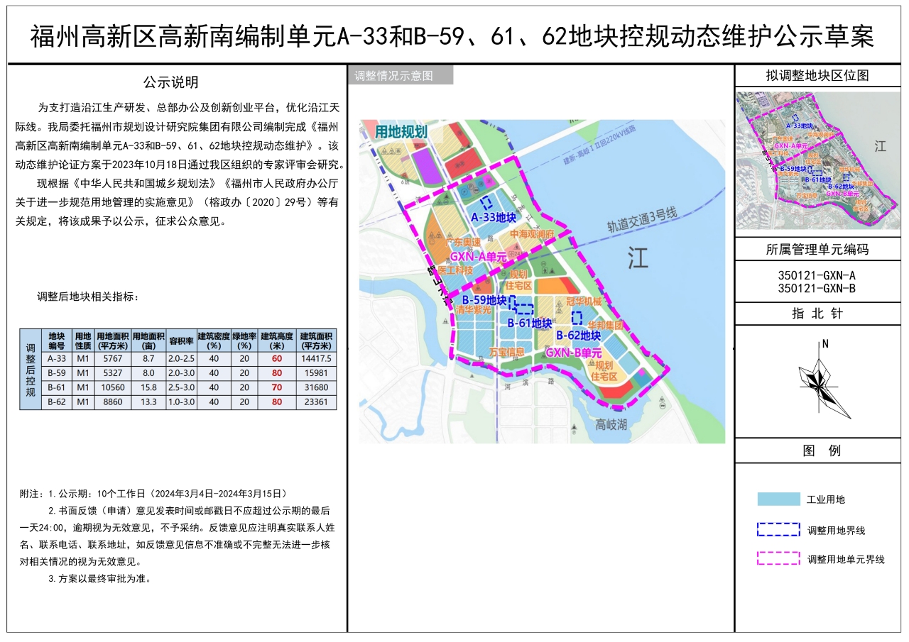 附件:福州高新南编制单元A-33和B-59、 61、 62地块控规动态维护公示稿