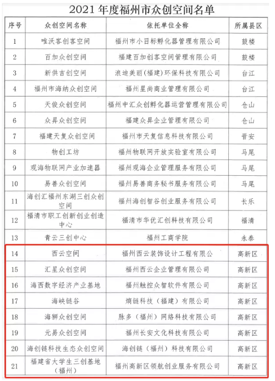 好消息!近日福州市科学技术局公布2021年度福州市众创空间(第十批)名单全市共有21家众创空间入选博彩网站导航 独占8家!是上榜数量最多的区