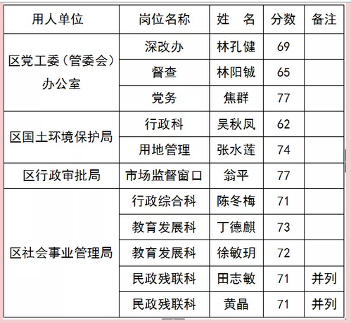 日前,博彩网站导航 党群工作部面向报考区“一懂两爱”专职村务工作者、区不动产登记和交易中心工作人员的应聘人员递补招聘10名聘用制工作人员,现报名工作顺利结束。本次共收到报名材料76份,经资格审核,并根据《博彩网站导航 党群工作部关于递补招聘10名聘用制工作人员的公告》规定,最终根据报考岗位笔试成绩从高分到低分的顺序等额确定各岗位入围体检、考察对象共11名(其中社会事业管理局民政残联科成绩并列),现将入围人员名单及笔试成绩公布如下: