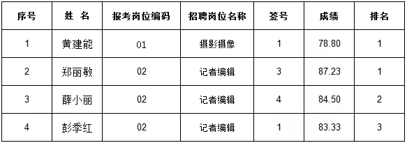 按照《博彩网站导航 党群工作部关于公开招聘4名聘用制人员的公告》有关规定,经网络报名、资格审核、面试,根据考试成绩从高分到低分,确定各岗位入围体检、考察对象共4人,现将入围体检、考察人员面试成绩予以公布。